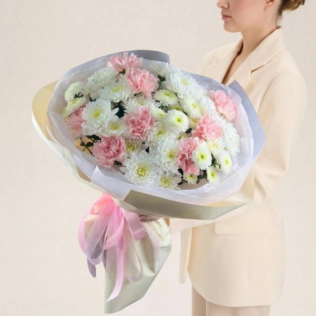 Трио букет с хризантемами и гвоздикой
