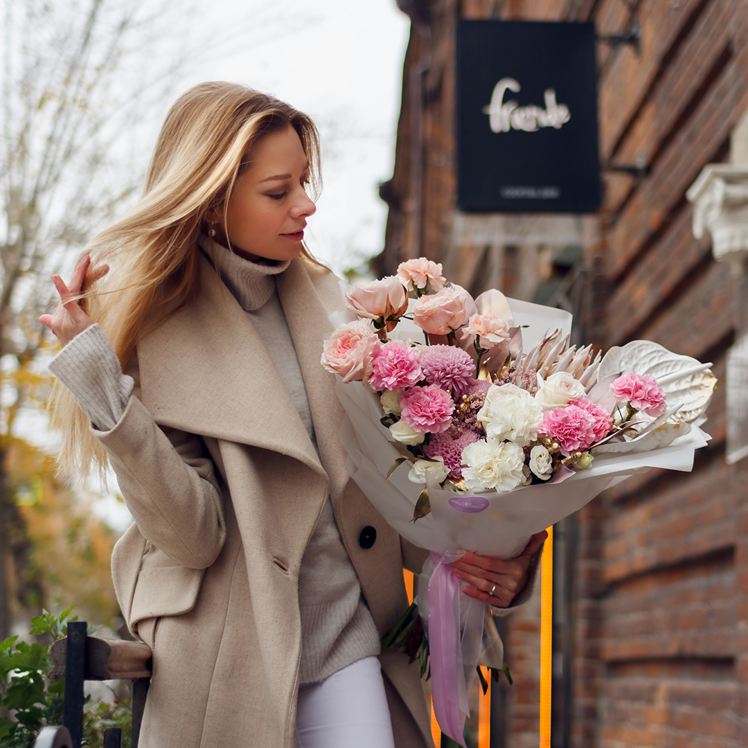 Некоторые цветы и материалы являются сезонными и могут быть недоступны в данный момент, поэтому мы оставляем за собой авторское право определять конечный состав букета.