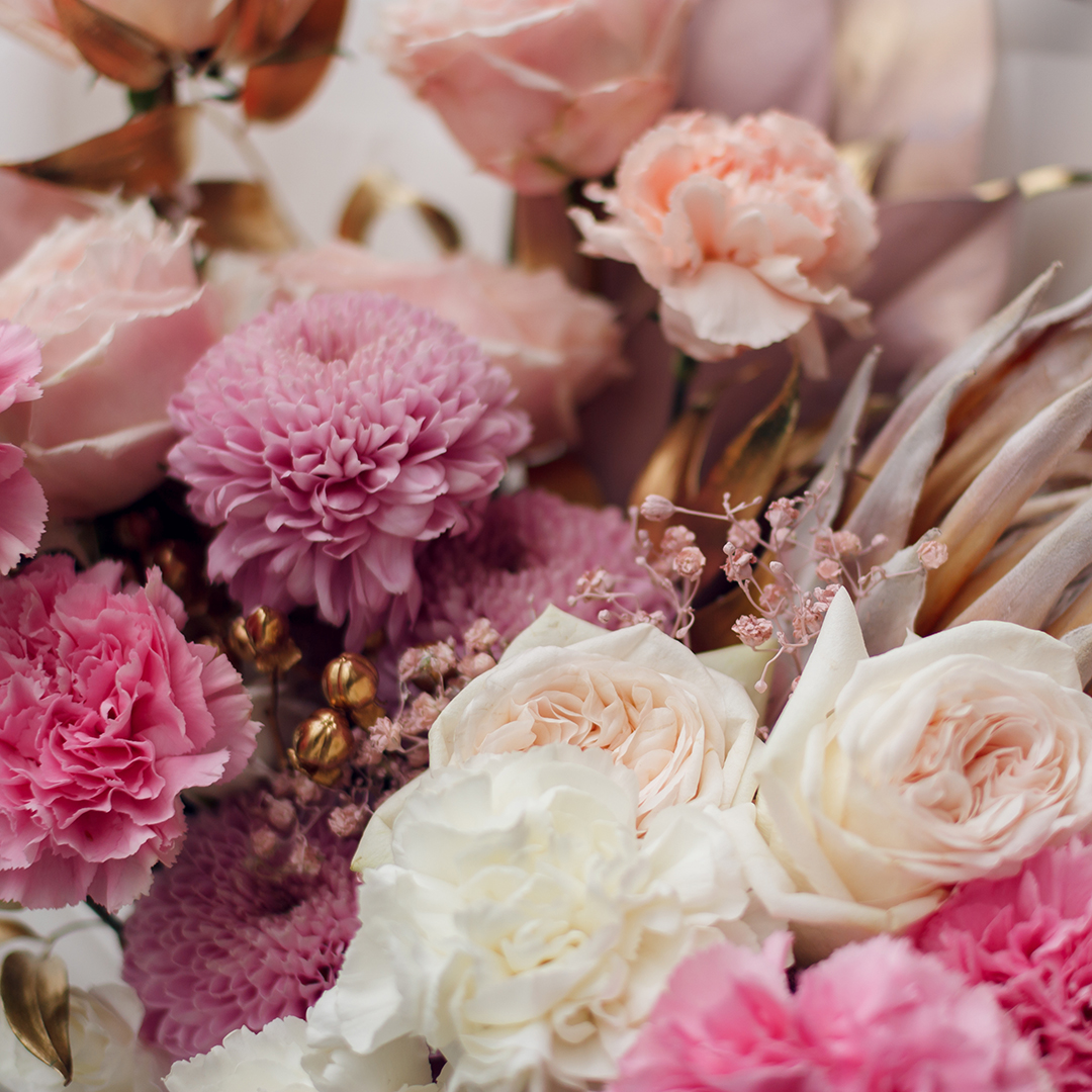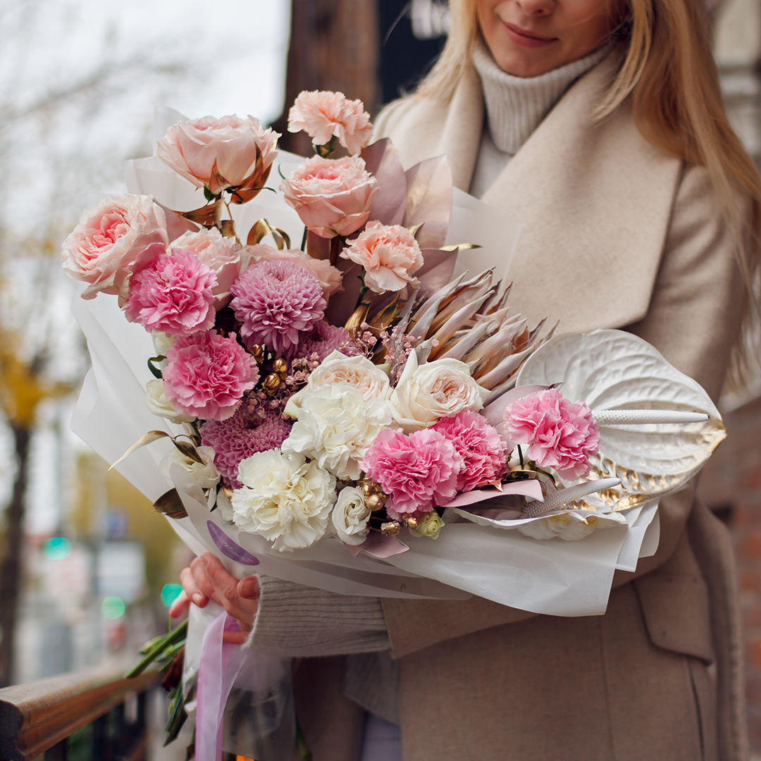 Наполнение: роза пионовидная, гвоздика, хризантема, рускус, протея, антуриум, эустома, гипсофила, магнолия.