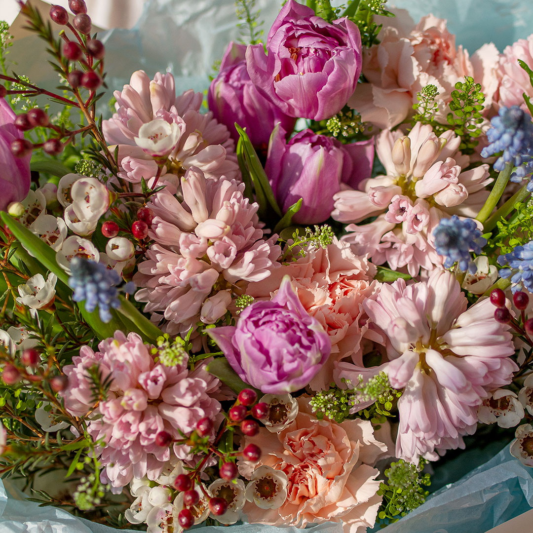 <b>Состав</b>: гиацинт, тюльпан французский, гвоздика, мускари, ваксфлауер, грин бель<br>