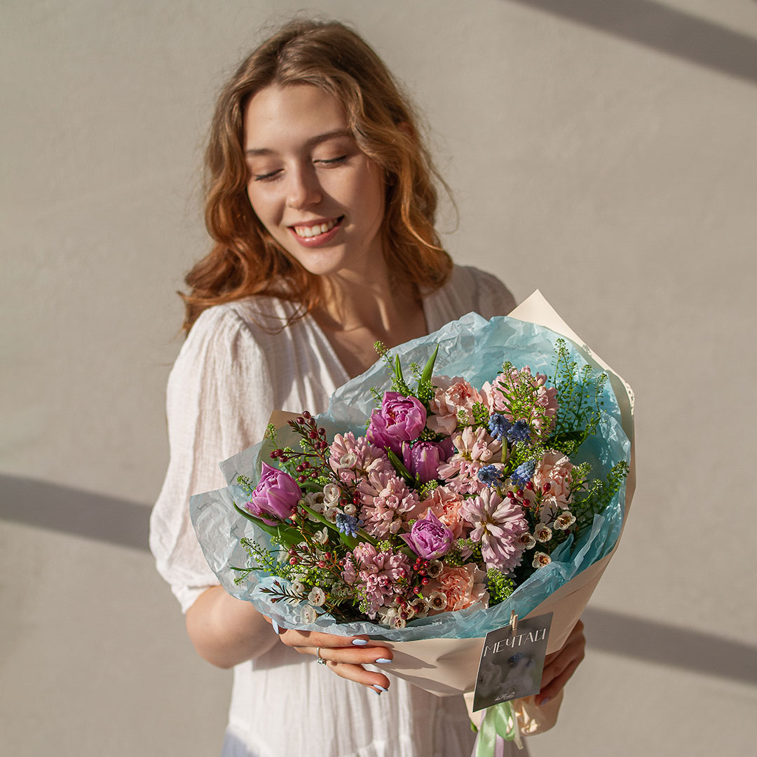 Некоторые цветы и материалы являются сезонными и могут быть недоступны в данный момент, поэтому мы оставляем за собой авторское право определять конечный состав букета.