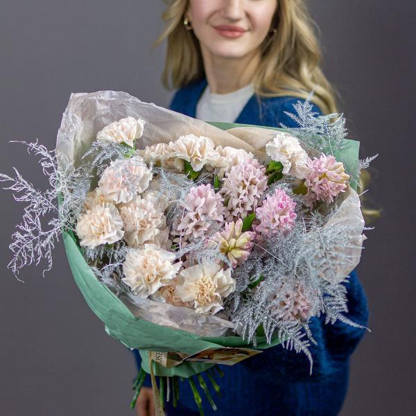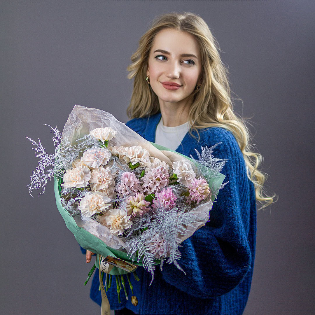 Некоторые цветы и материалы являются сезонными и могут быть недоступны в данный момент, поэтому мы оставляем за собой авторское право определять конечный состав букета.