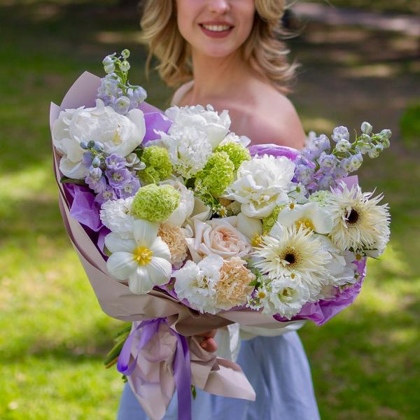 Состав: Дельфиниум, пион, вибурнум, гербера, роза поновидная, эустома, тюльпан, гвоздика