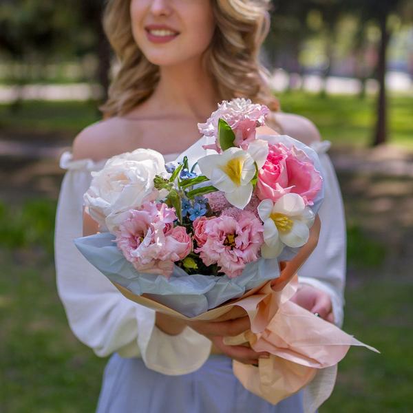 Состав: пион, эустома, оксипеталум, тюльпан, роза одиночная, хризантема, роза кустовая