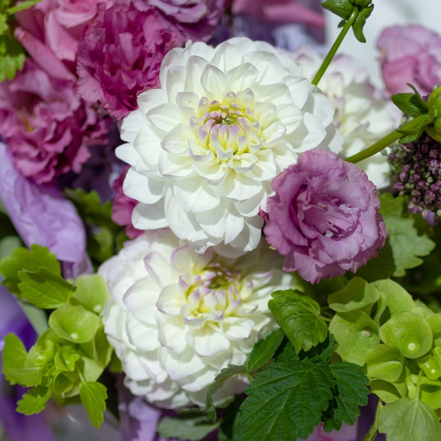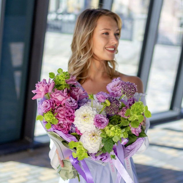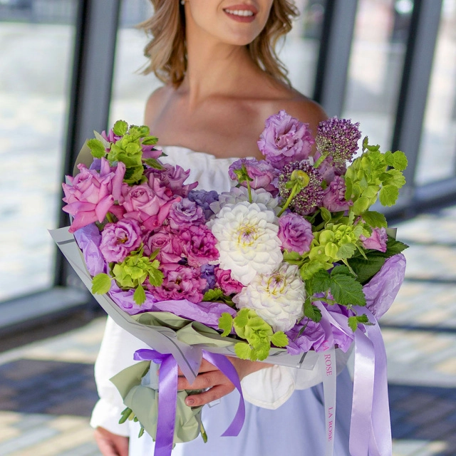 Состав: гортензия, эустома, георгин, молюцелла, аллиум, роза одиночная