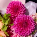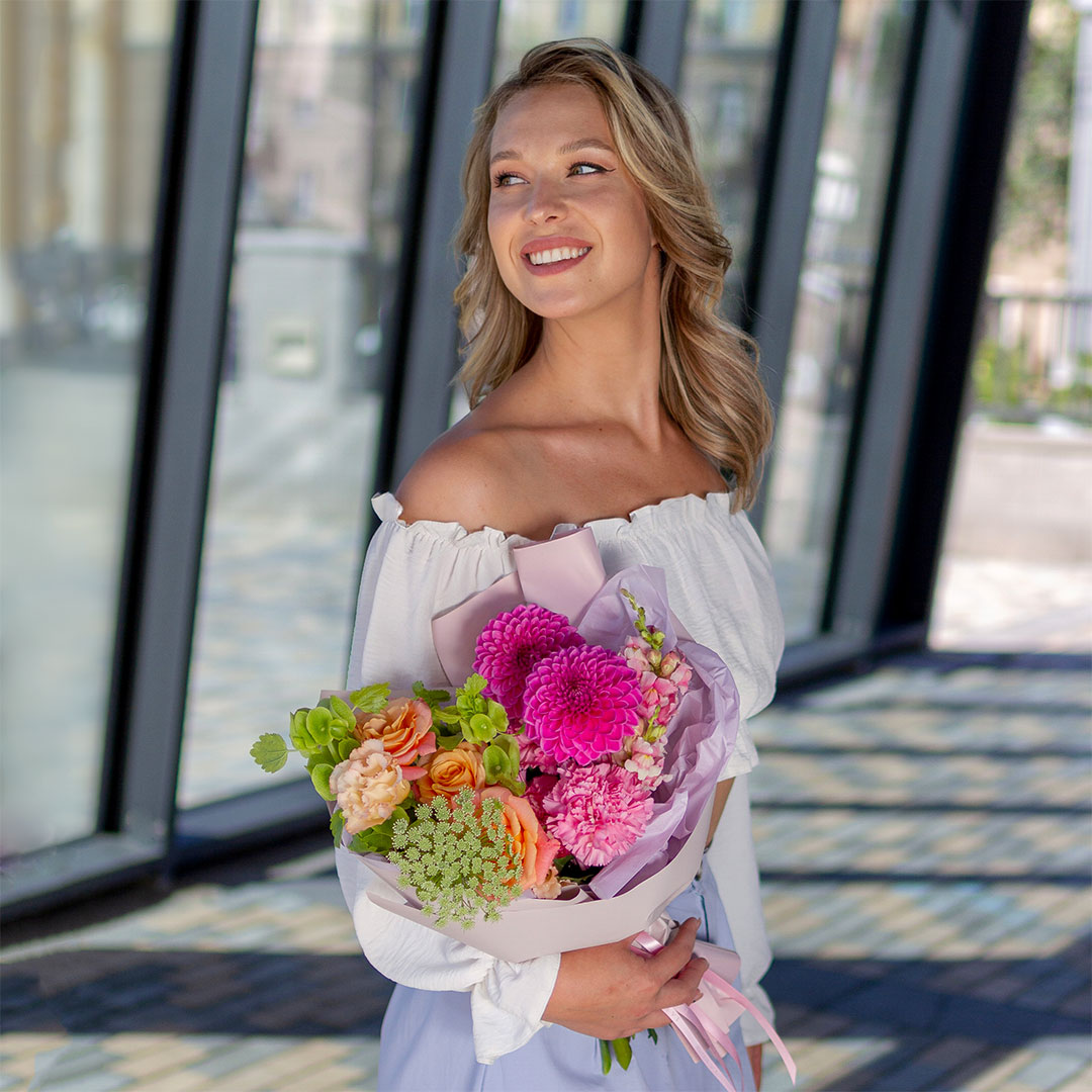 Состав: георгины, гвоздика, роза одиночная, эустома, моллюцелла, амми, бирючина.