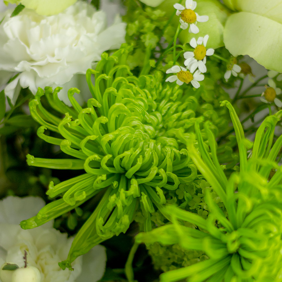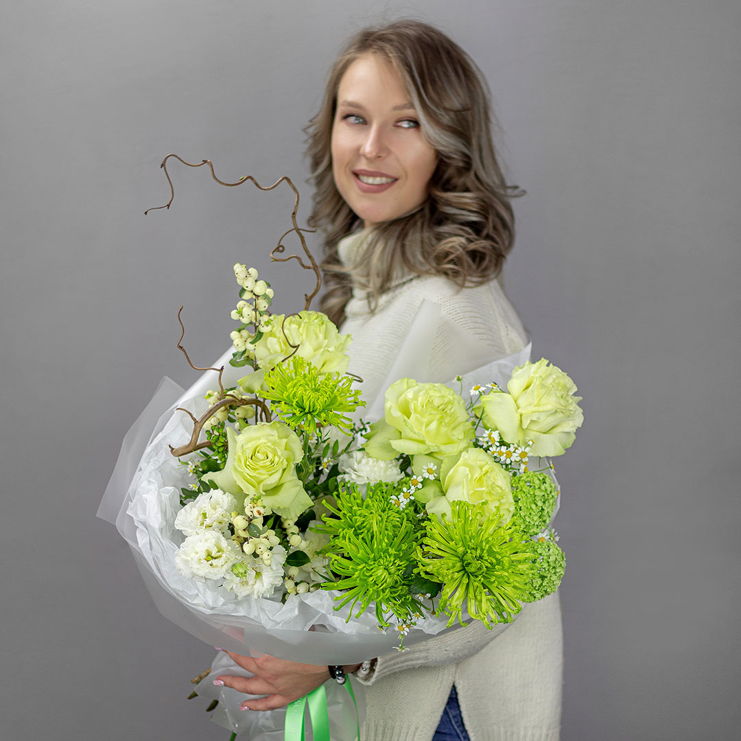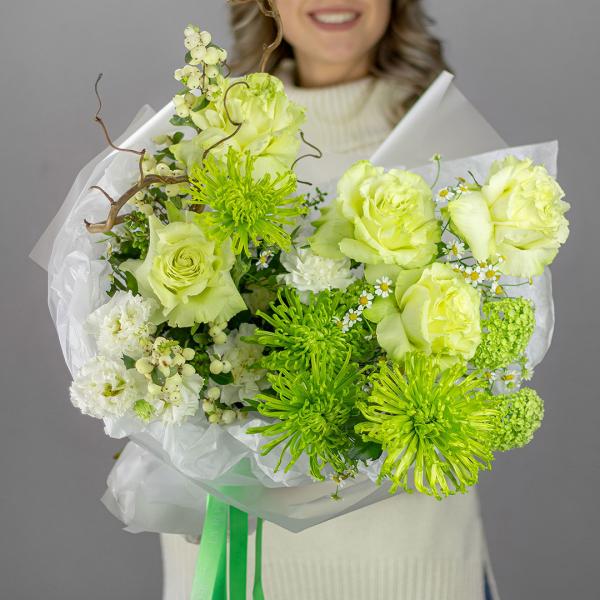 Состав: хризантема, роза, гвоздика, эустома, матрикария, вибурнум, бирючина, фисташка, снежноягодник, корилус.