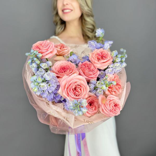 Букет сочетает розовые пионовидные розы и фиолетовые дельфиниумы. Композиция отличается контрастом форм: округлые полные бутоны пионовидной розы дополняются вертикальными соцветиями дельфиниумов. Цветовая гамма объединяет нежный розовый и глубокий фиолетовый оттенки. Такое сочетание подходит для выражения самых нежных чувств, демонстрации зарождающихся отношений и в качестве подарка для ценителей необычных цветочных композиций.