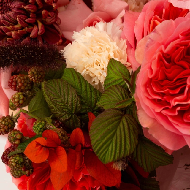 Роза 60 см Эквадор Be Sweet, Роза Пионовидная 60 см Эквадор Candy X-pression, Гвоздика одиночная Brut Geoflora, Рубус Chester, Хризантема одиночная Bigoudi Red, Эвкалипт Stuartia MIX, Малина, Фисташка срезка