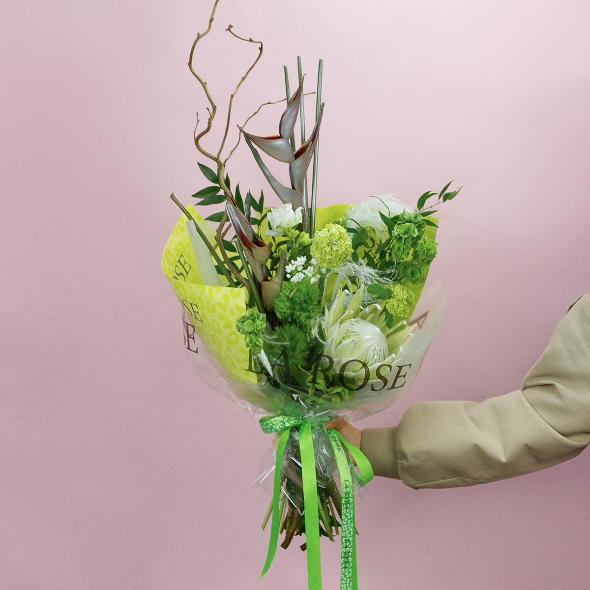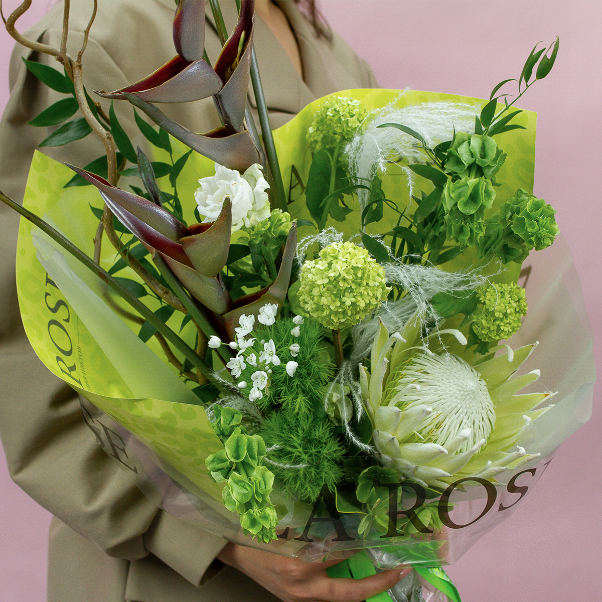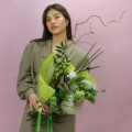 Протея, геликония, гвоздика, кампанула, вибурнум, аллиум, молюцелла, хеллеборис
