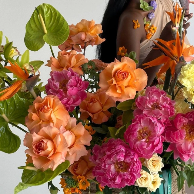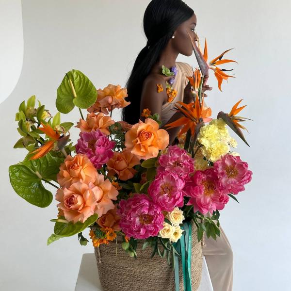 пионы ,роза, стрелиция ,антуриум, орхидея , гвоздика , лист козии, хелеборус , Роза кустовая ,орнитогалум ,корзина .