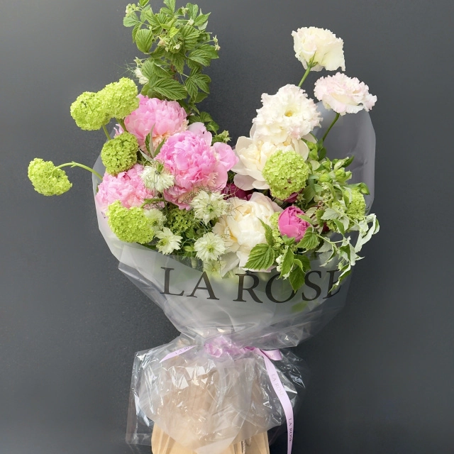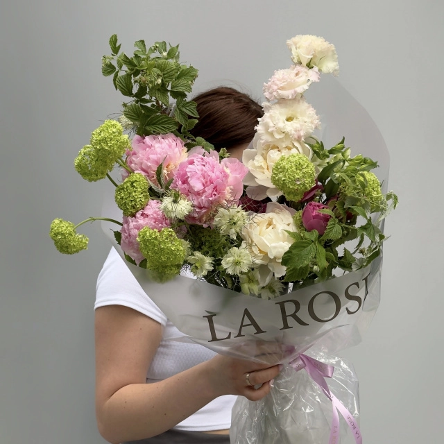 Пионы, Вибурнум, Эустома, Листья малины, Нигелла, Кустовая роза, Альстромерия, Упаковка, Лента