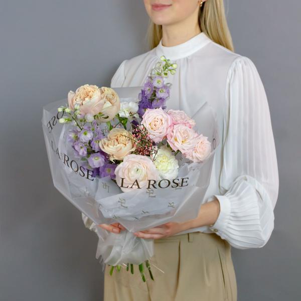 Размер M: Дельфиниум, Гвоздика, Роза кустовая Мадам Бомбастик, Роза Пионовидная Шифон, Ранункулус Cloni, декоративная упаковка
