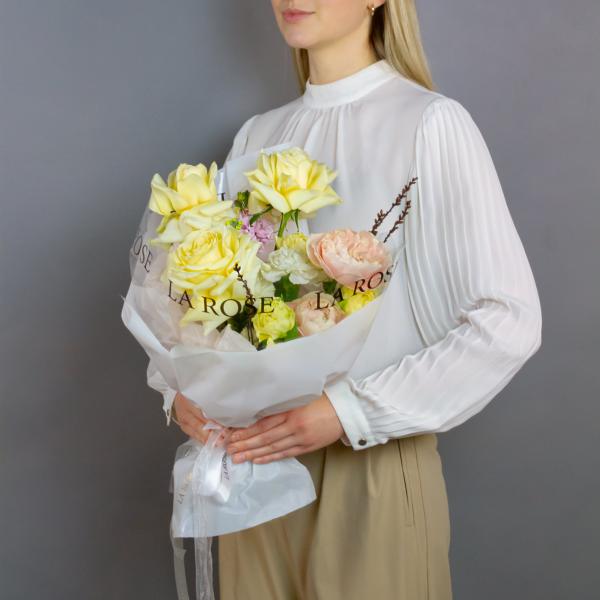 Размер S: Гвоздика (5 шт), Роза Пионовидная Шифон (2 шт), Роза Пионовидная Candlelight (3 шт), Тюльпан белый пионовидный (3 шт), Левкой (2 шт) Краснодар Pink (2 шт), Мирика Gagel (1 шт), декоративная упаковка