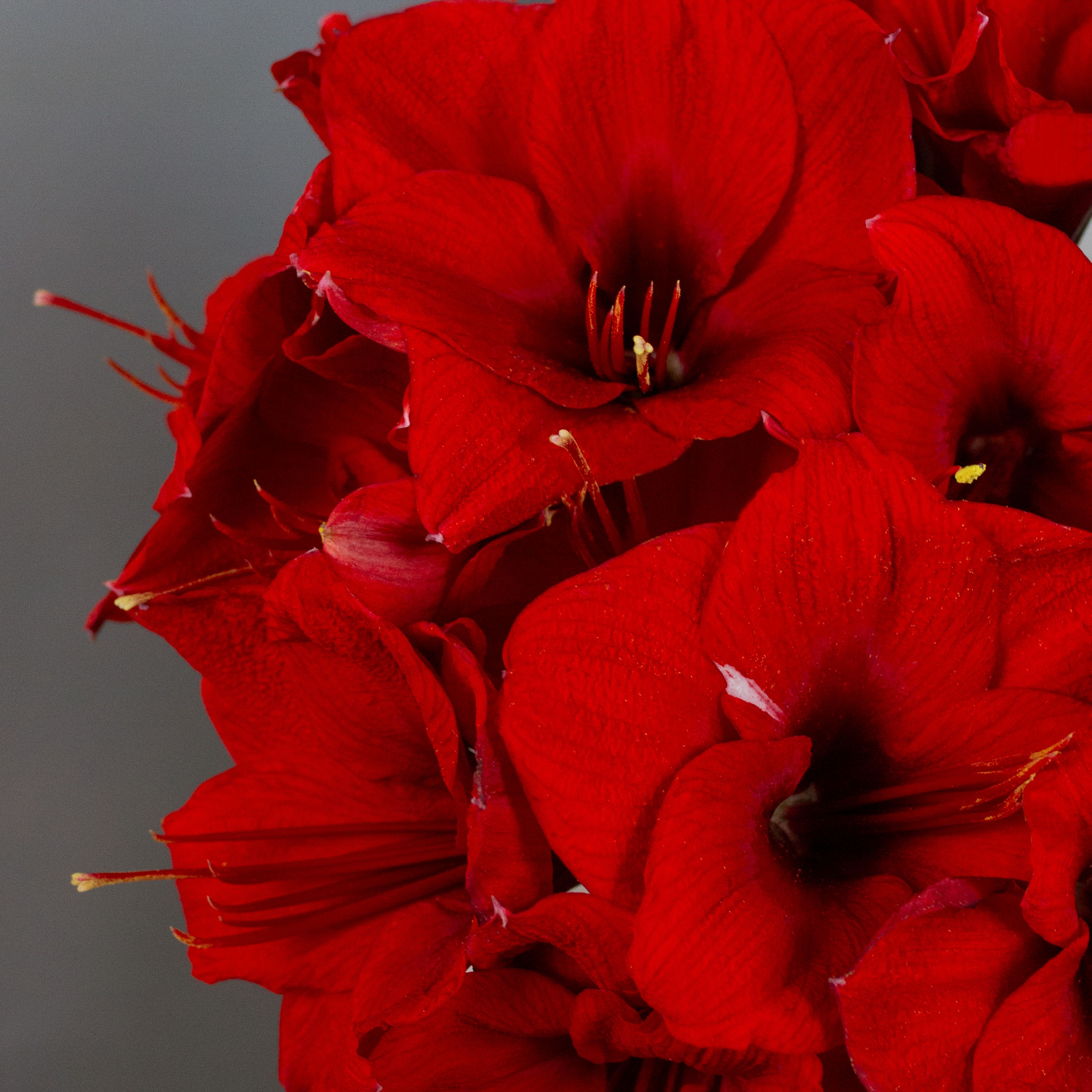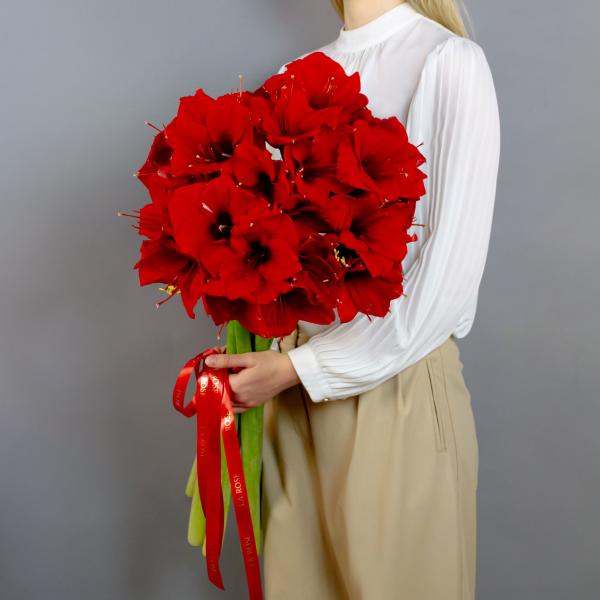 Роскошный букет из ярких красных амариллисов — воплощение страсти и глубоких чувств. Крупные бархатистые бутоны словно пламя согревают сердце и говорят о любви без слов. Идеальный подарок для тех, кто дорог вашему сердцу.