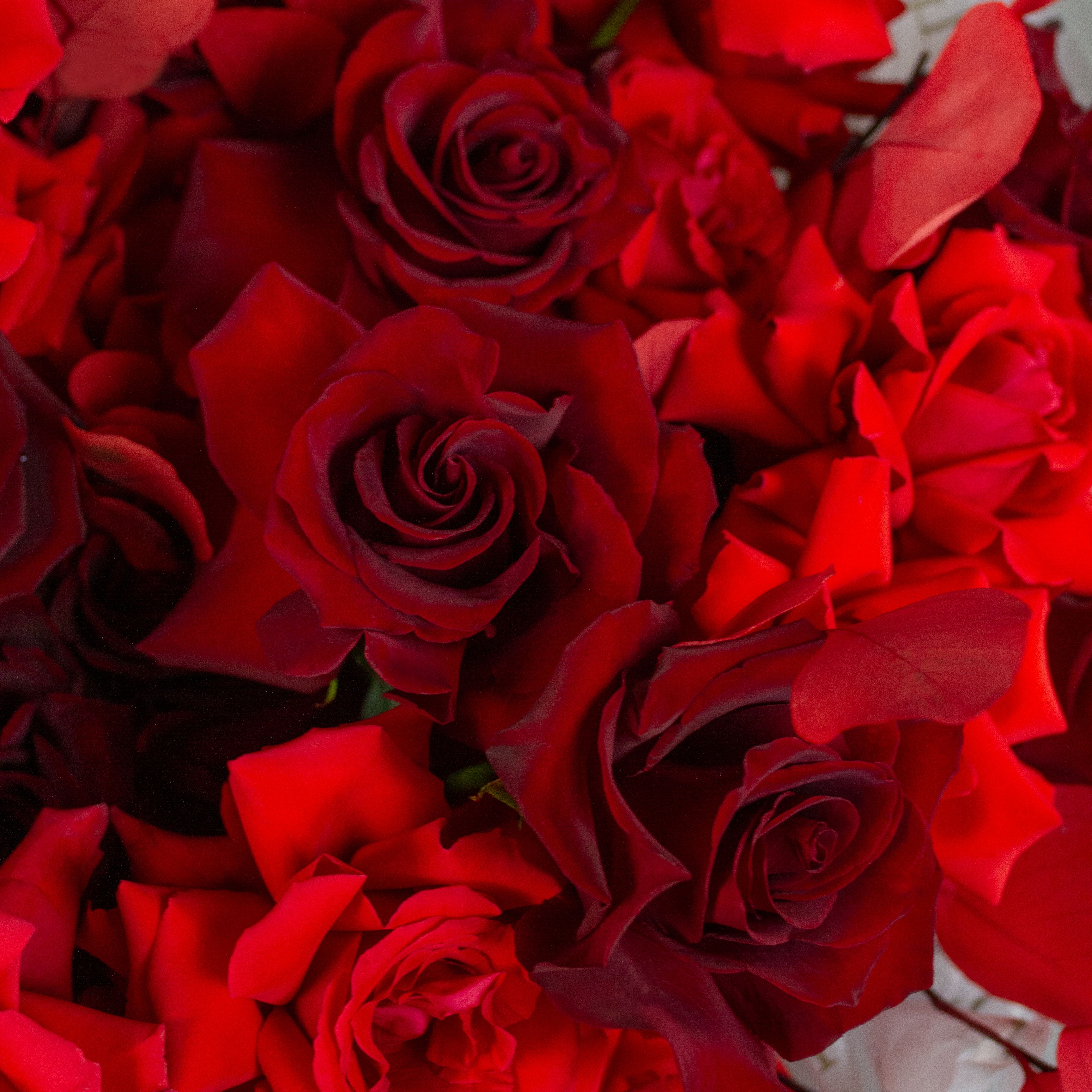 Страстная композиция из элитных сортов Explorer и Nina в благородном красном оттенке. Дополнена стабилизированной цинерией и эвкалиптом для создания драматичного эффекта.