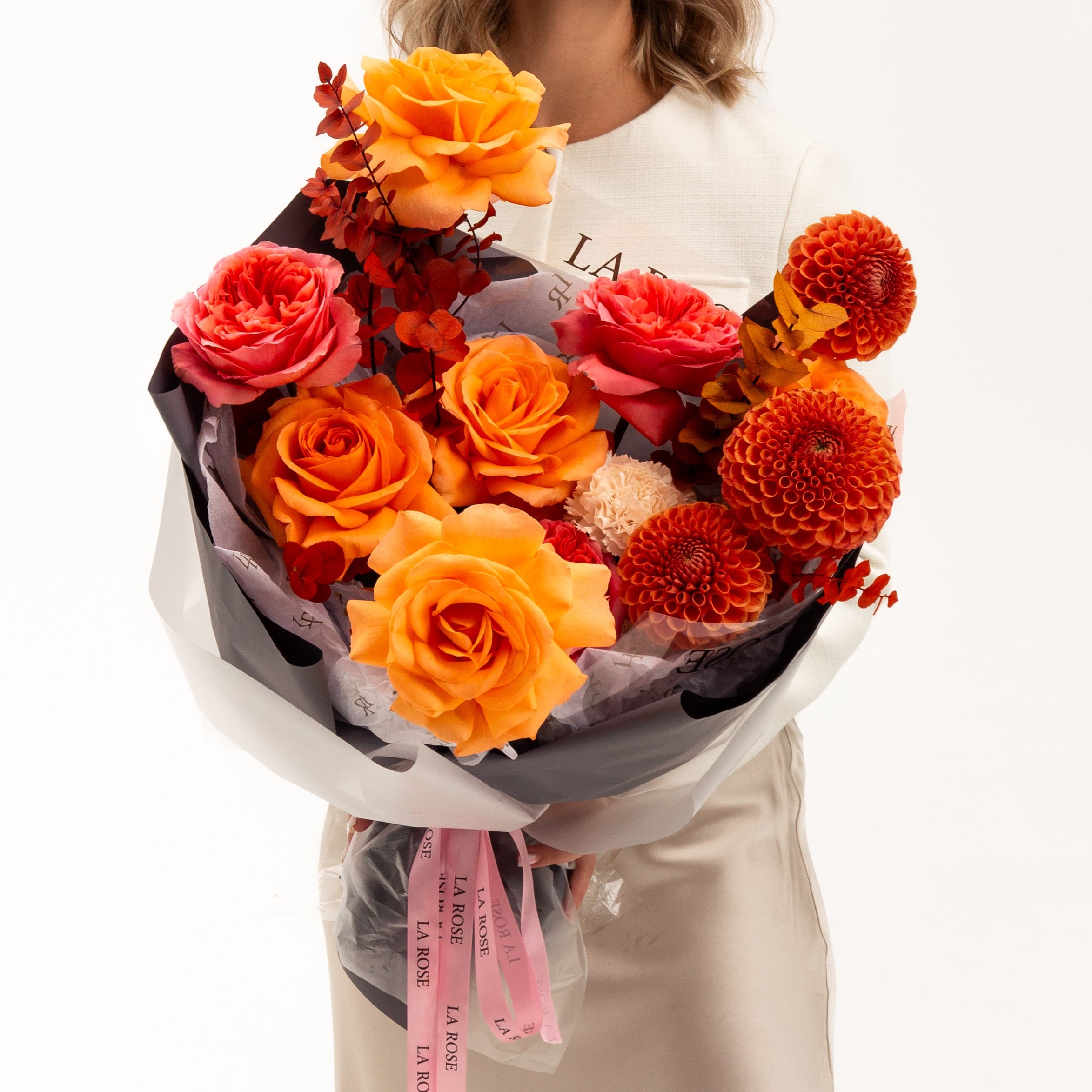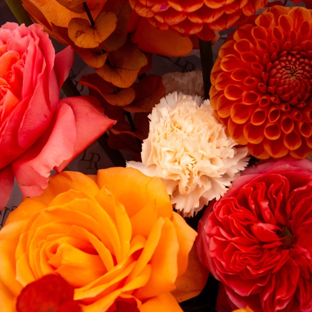 Георгин срезка, Роза Пионовидная 60 см Эквадор Candy X-pression, Гвоздика одиночная Brut Geoflora, Эвкалипт Stuartia MIX, Роза 60 см Эквадор Coral Reef