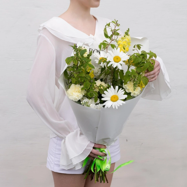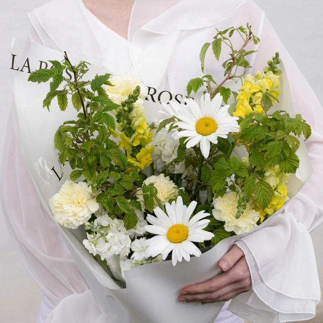 Некоторые цветы и материалы являются сезонными и могут быть недоступны в данный момент, поэтому мы оставляем за собой авторское право определять конечный состав букета.