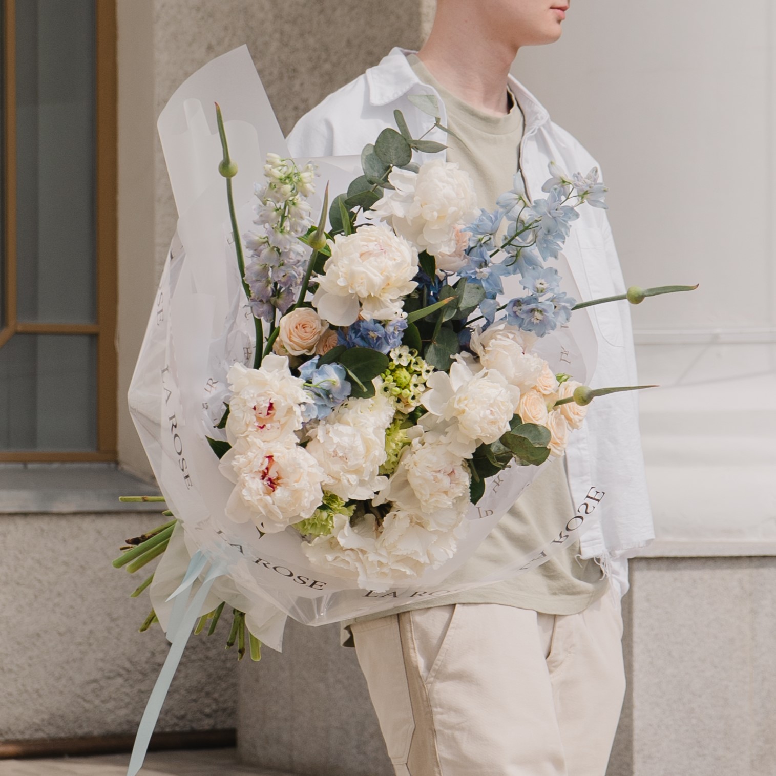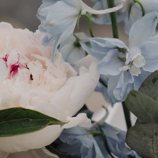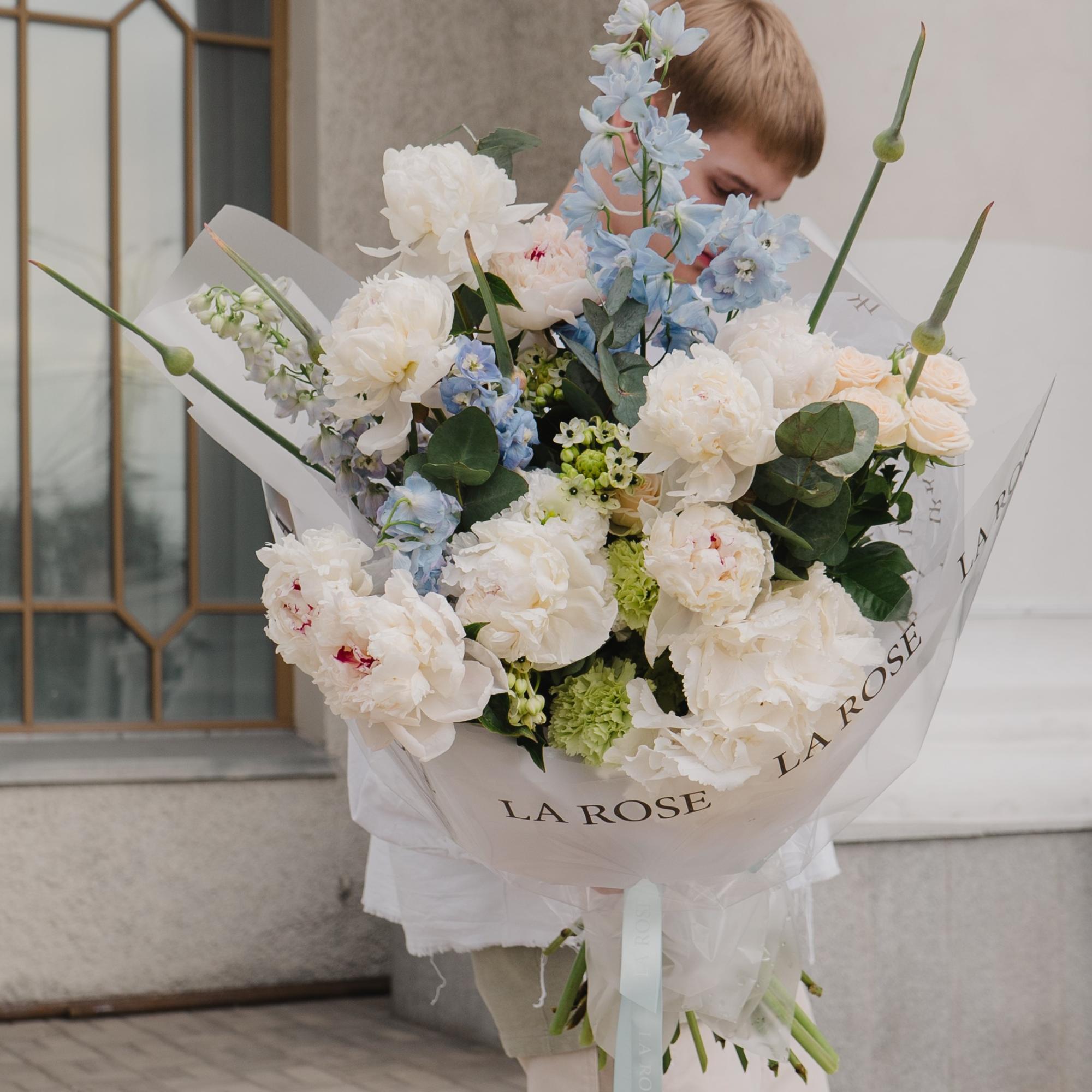 Букет с пионами и дельфиниумом