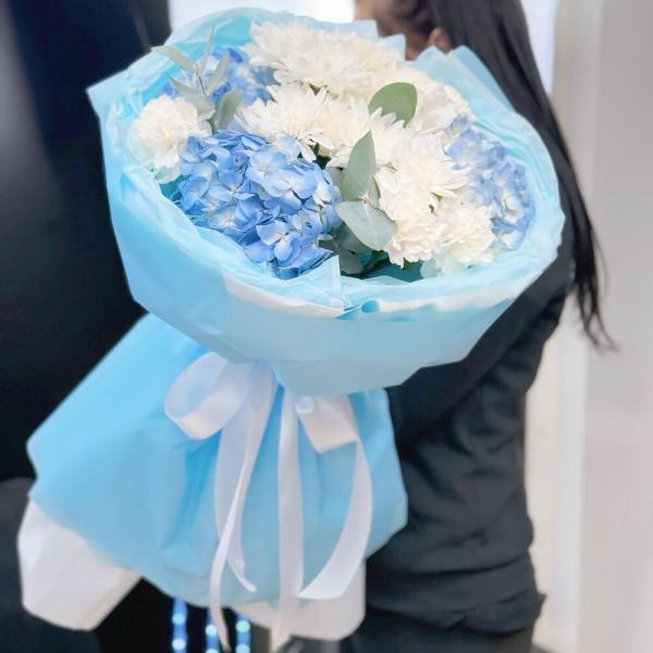 Этот утонченный букет сочетает в себе пышную гортензию и нежные диантусы, создавая гармоничную композицию, которая покоряет с первого взгляда.