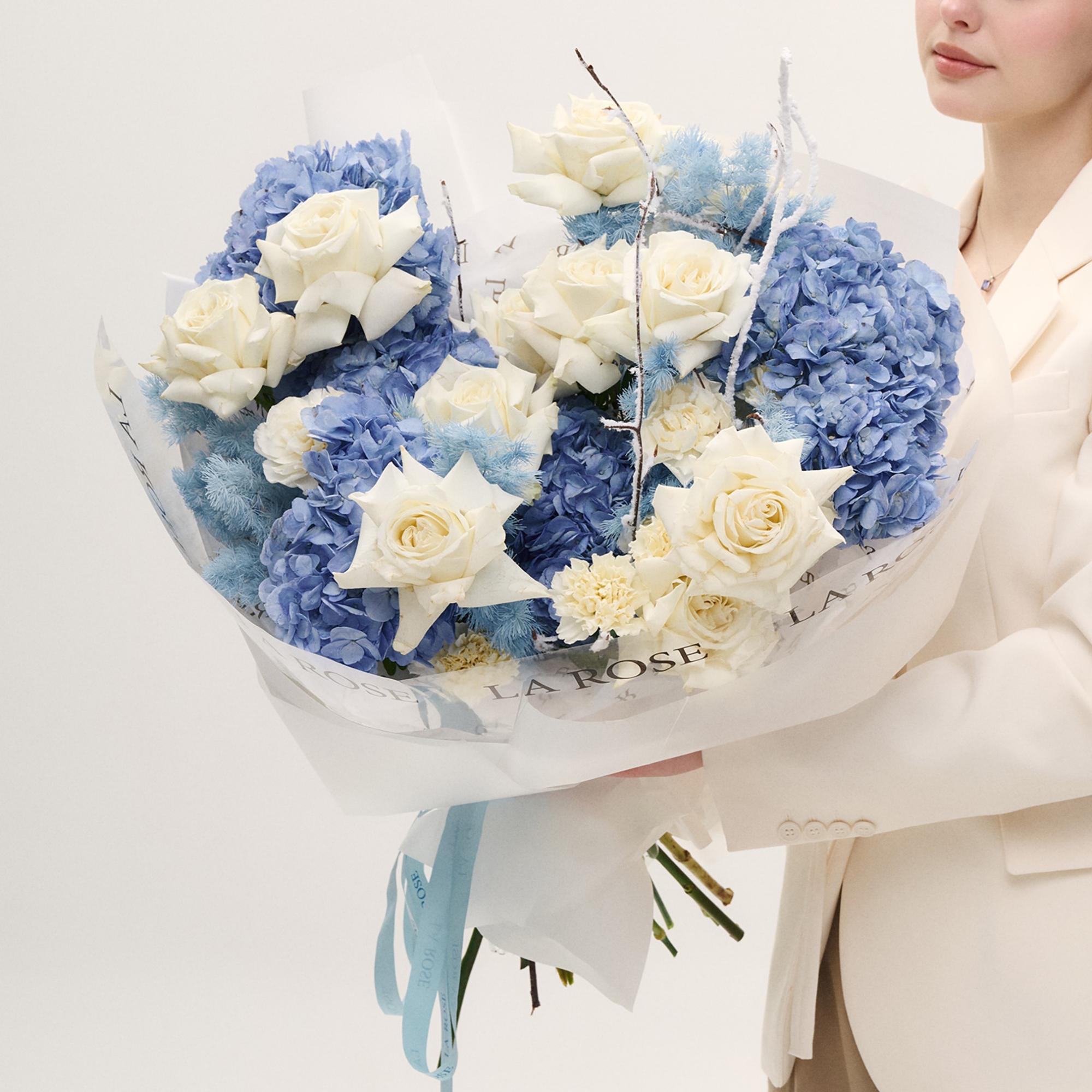 Букет в голубых оттенках с гортензией и аспарагусом