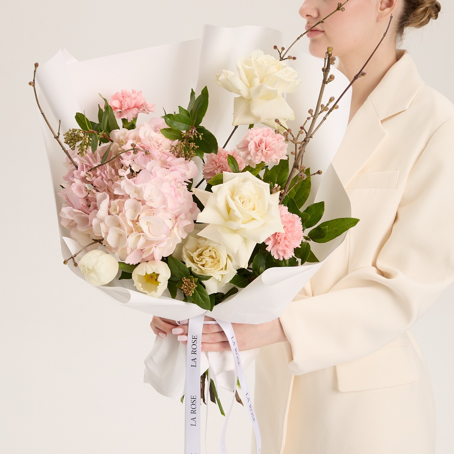 Некоторые цветы и материалы являются сезонными и могут быть недоступны в данный момент, поэтому мы оставляем за собой авторское право определять конечный состав букета.