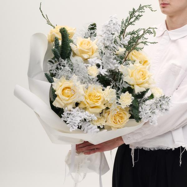 Некоторые цветы и материалы являются сезонными и могут быть недоступны в данный момент, поэтому мы оставляем за собой авторское право определять конечный состав букета.