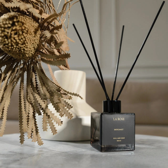 Стильный ароматический диффузор в темном флаконе прекрасно впишется в любой интерьер и наполнит Ваше помещение удивительными ароматами.
