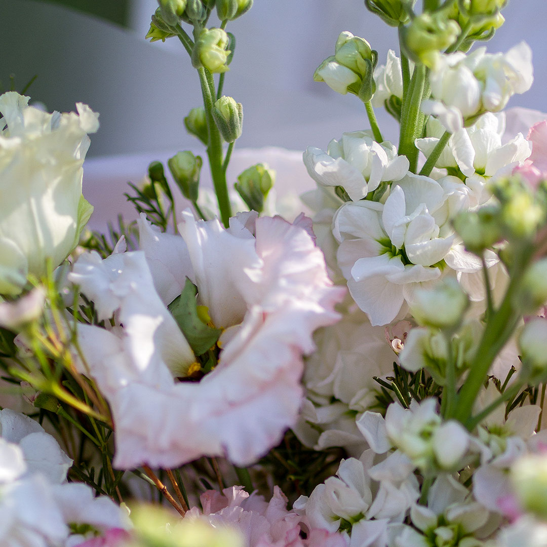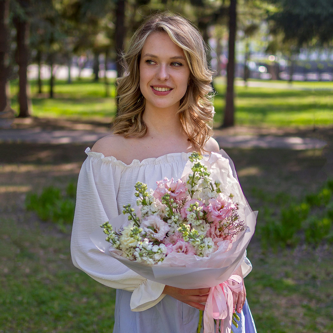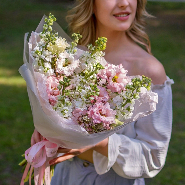 Состав: левкой, эустома, ваксфлауэр