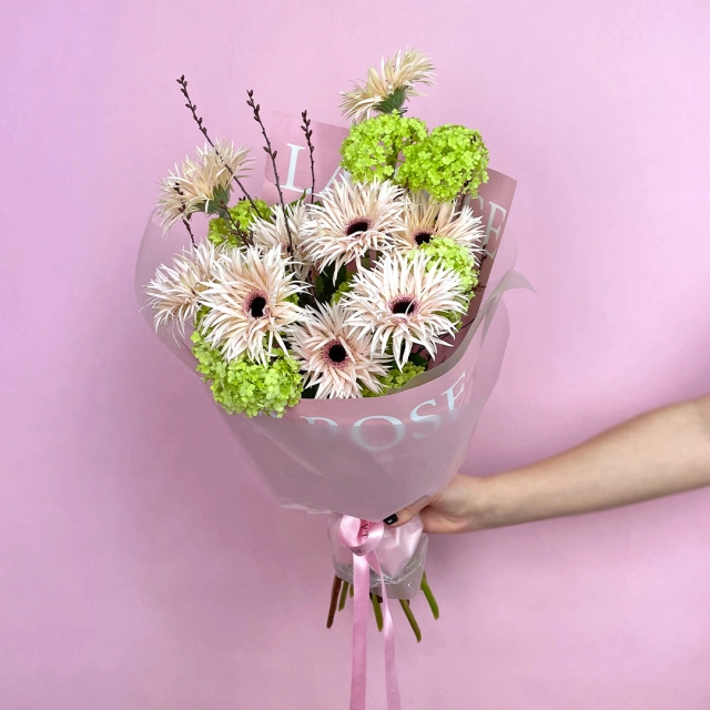 роза пионовидная одиночная, роза кустовая, гербера, вибурнум, дельфиниум, гвоздика