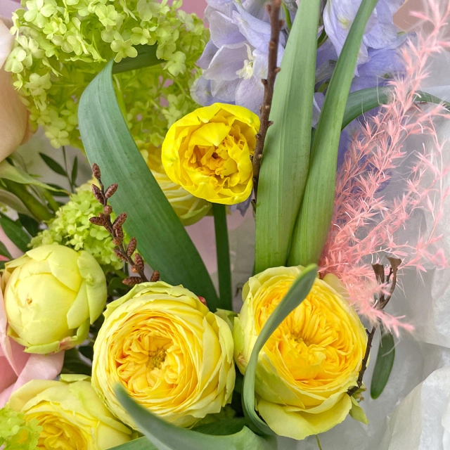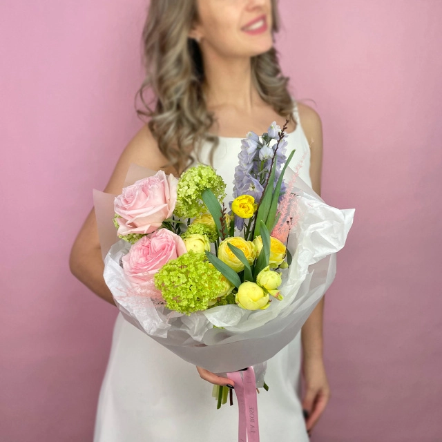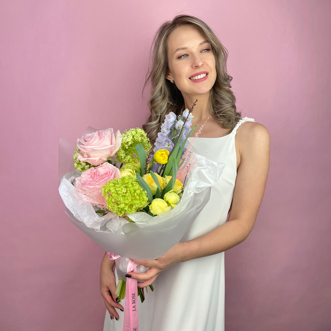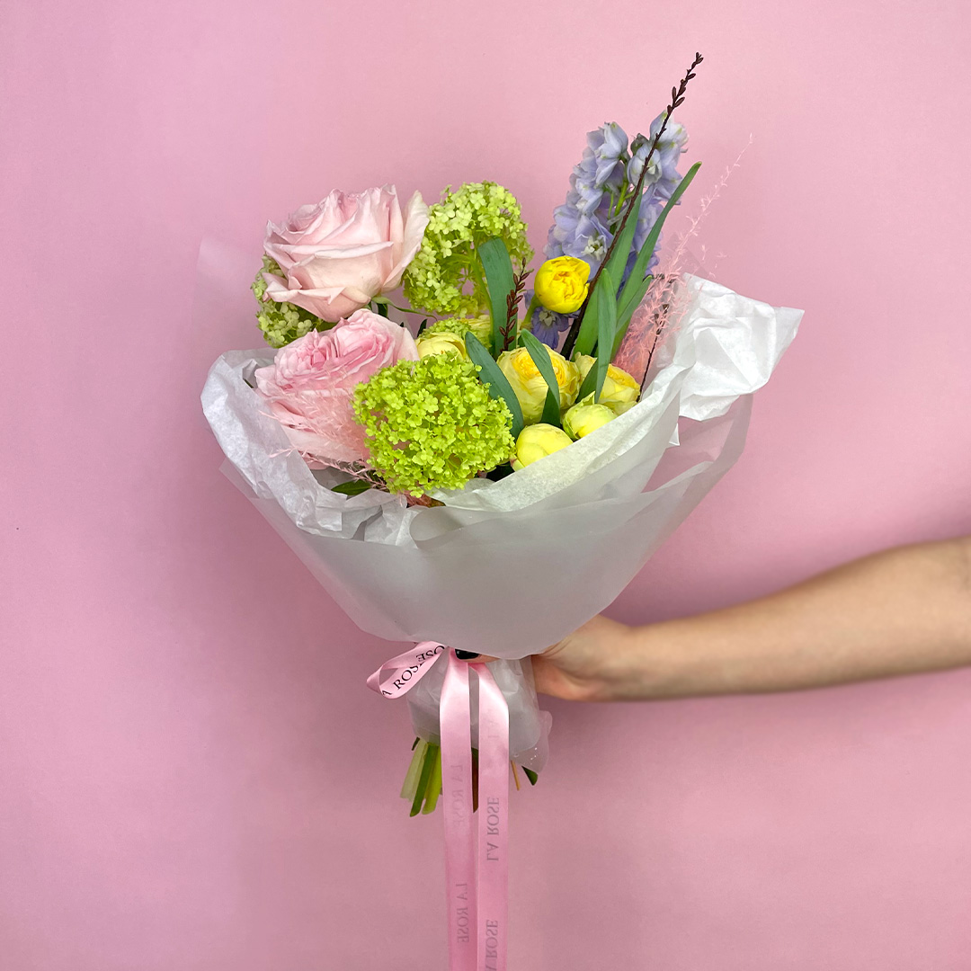 Некоторые цветы и материалы являются сезонными и могут быть недоступны в данный момент, поэтому мы оставляем за собой авторское право определять конечный состав букета.
