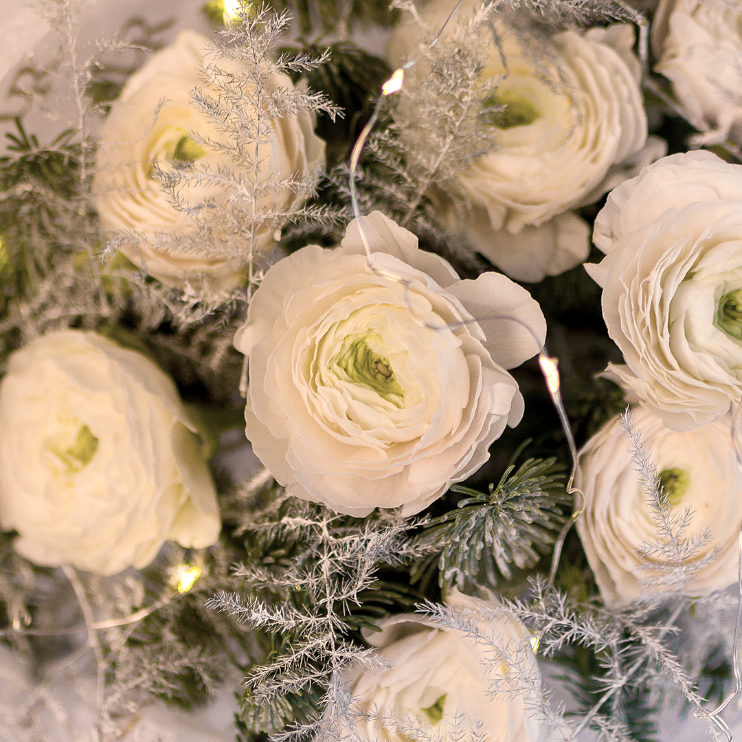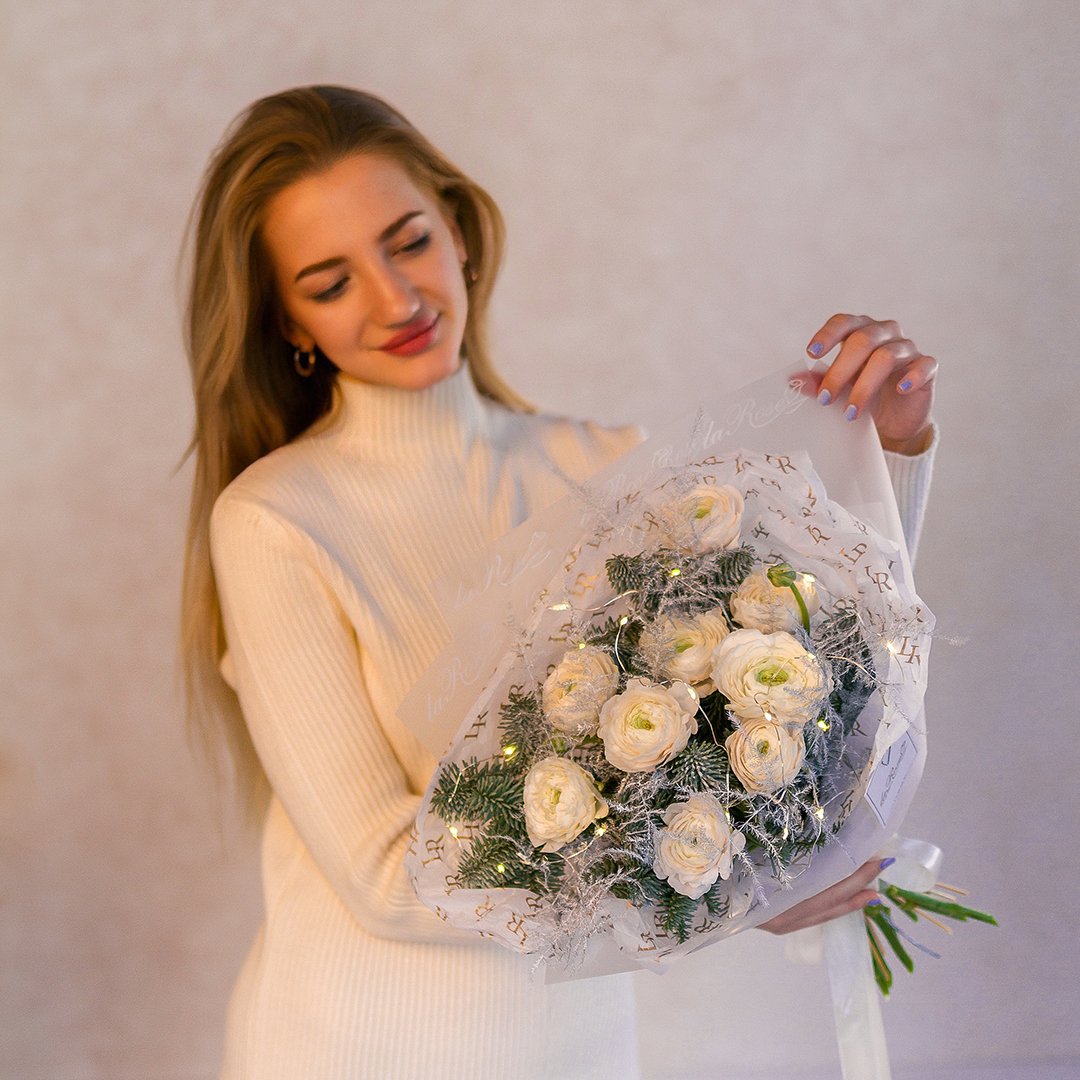 Состав: ранункулюсы, аспарагус, ветка ели
